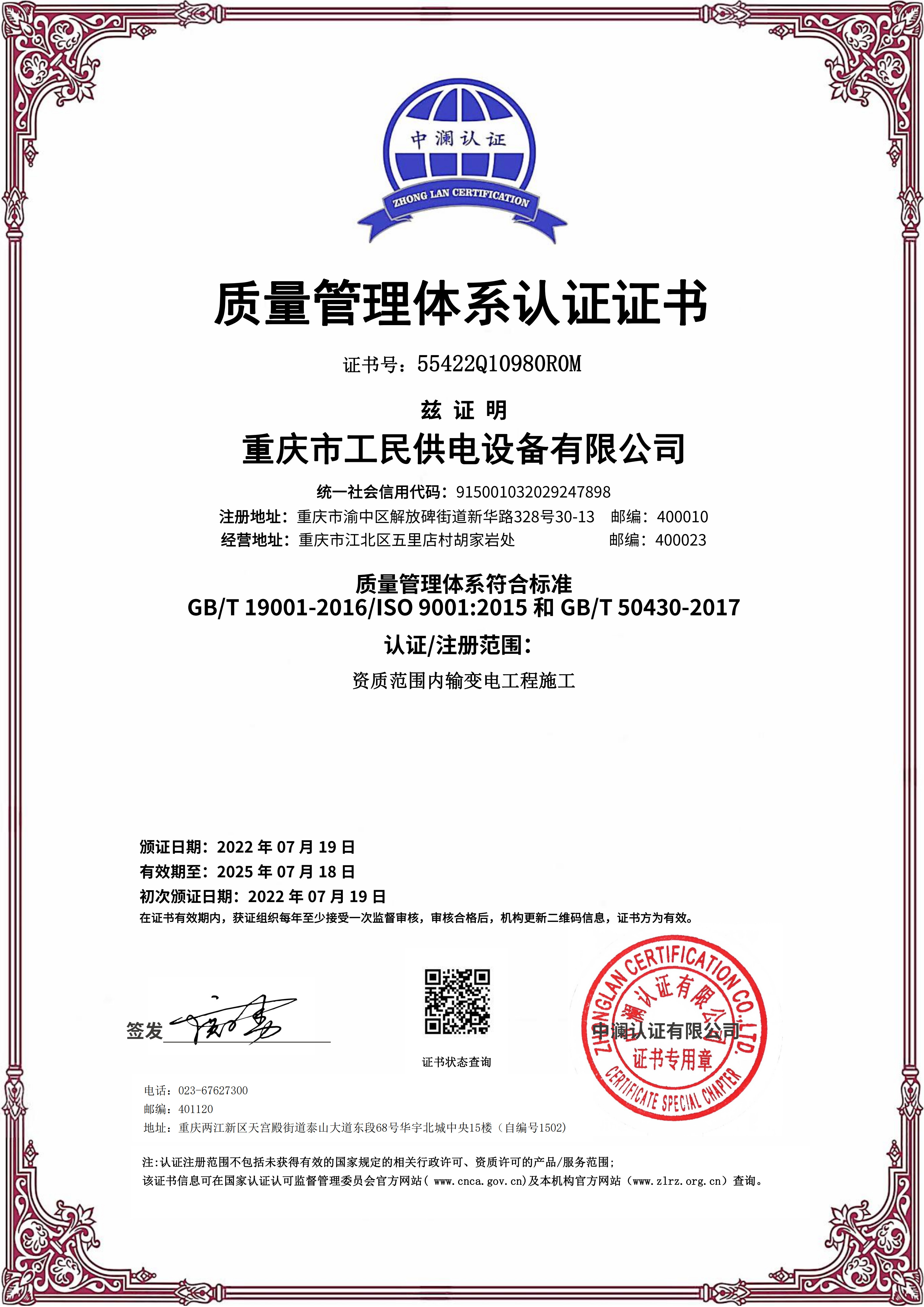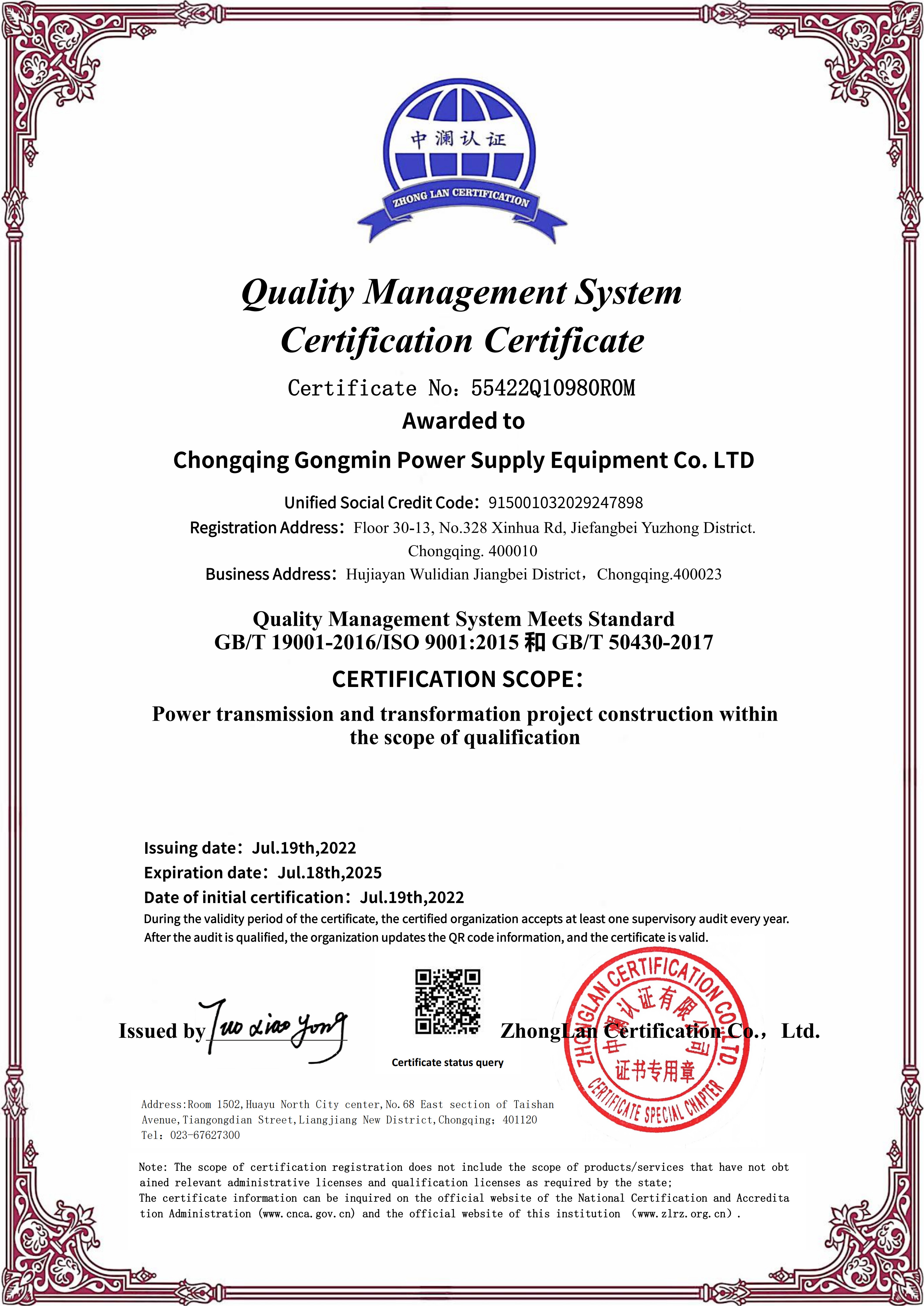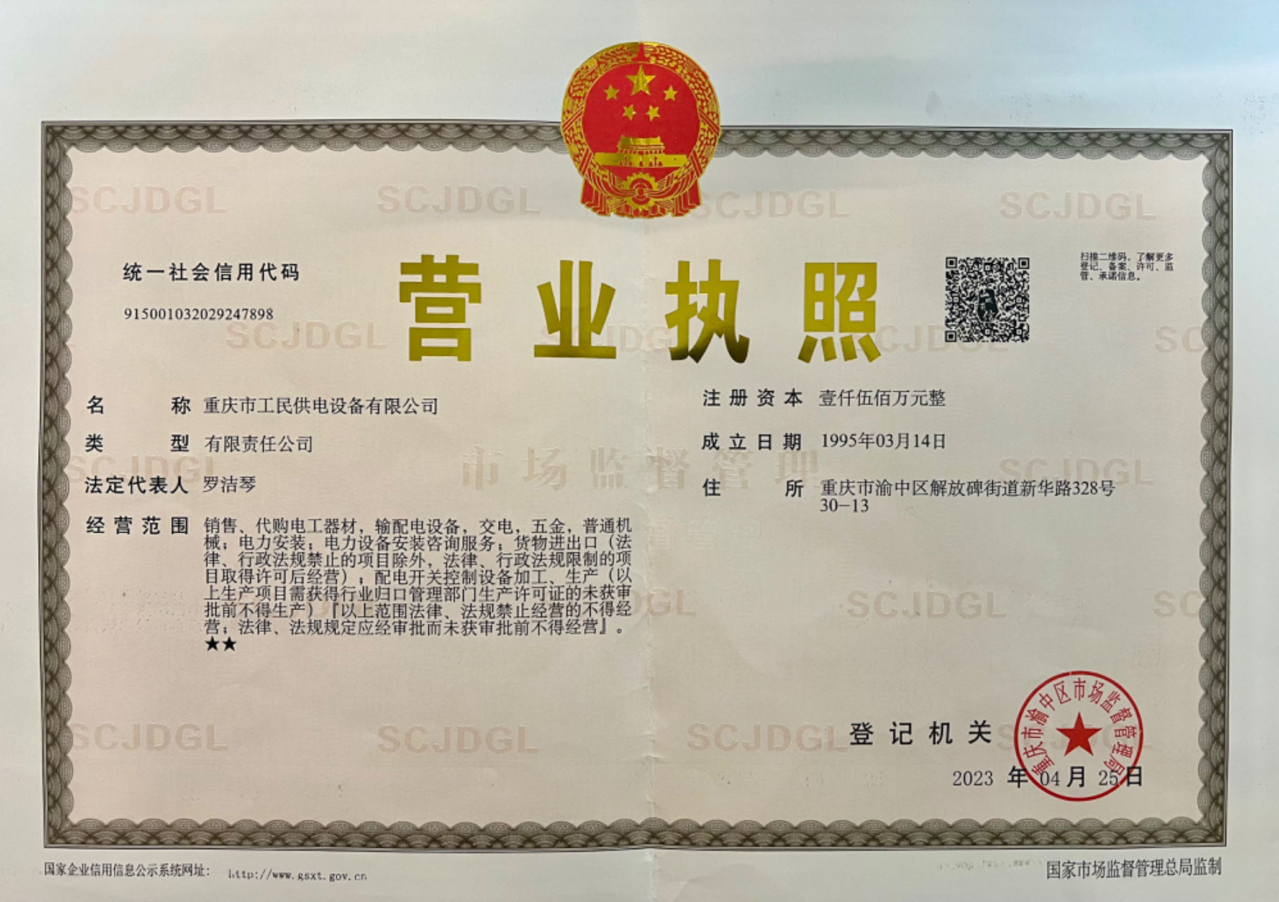 Chongqing Gongmin Power Supply Equipment Co., Ltd. was founded in 1986 with a registered capital of 15 million yuan. The company is mainly committed to urban power construction in Chongqing. It is a professional company specializing in the installation of transmission and transformation projects, sales of power equipment, technical consulting, after-sales service, and import and export business. After years of development, Gongmin Power Supply Equipment Co., Ltd. has become a leader in the same industry in Chongqing and has obtained the IS9001 quality management system. Joined as a member of the Board of Directors of the Electric Power Administration Office of Chongqing Electric Power Company, Vice President of the Construction Association of Yuzhong District, Chongqing, and a member of the Board of Directors of the Chongqing Foreign Trade Promotion Bureau. Since its establishment, Gongmin Company has been awarded the title of annual exemplary organization every year. Gongmin Company values contracts and keeps promises, and has a good professional reputation both inside and outside the industry.